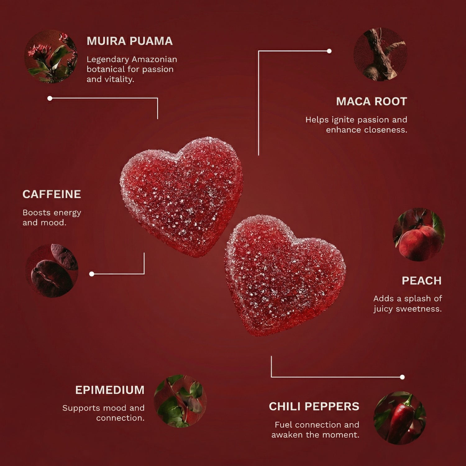 Each gummy is coated in a rich chili blend that stimulates circulation and triggers the release of feel-good endorphins, the same natural chemicals linked to pleasure, excitement, and connection.